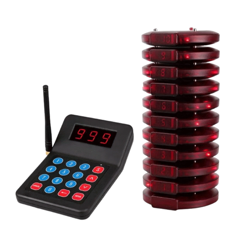 ตัวกดเรียกคิวแบบ wireless pager, มีตัวบัตรลูก สีแดง 10 ตัว, ระยะส่ง 30 เมตร ในพื้นที่โล่ง, รองรับ pager ได้ถึง 999 ตัว