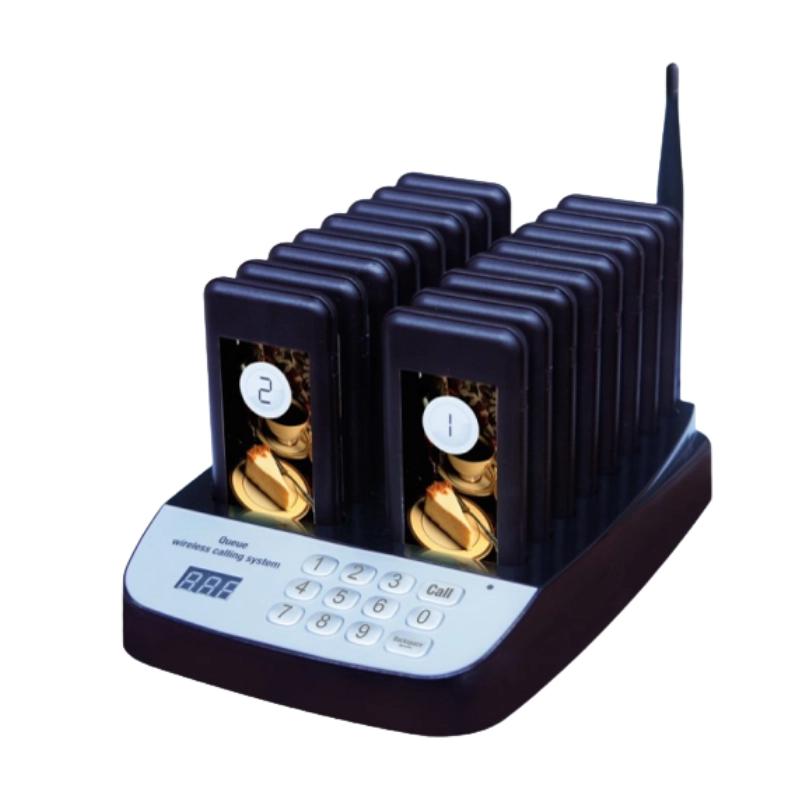 ตัวกดเรียกคิวแบบ wireless pager, มี ตัวกดเรียก 16 ตัว, ระยะส่ง 30 เมตร ในพื้นที่โล่ง, รองรับ pager ได้ถึง 999 ตัว, ตัวลูกรองรับระบบสั่น เสียงได้, ใช้คลื่น 433MHz ในการสื่อสาร, ตัวฐานชาร์จ 1 ตัว + adapter 12v 1 ตัว
